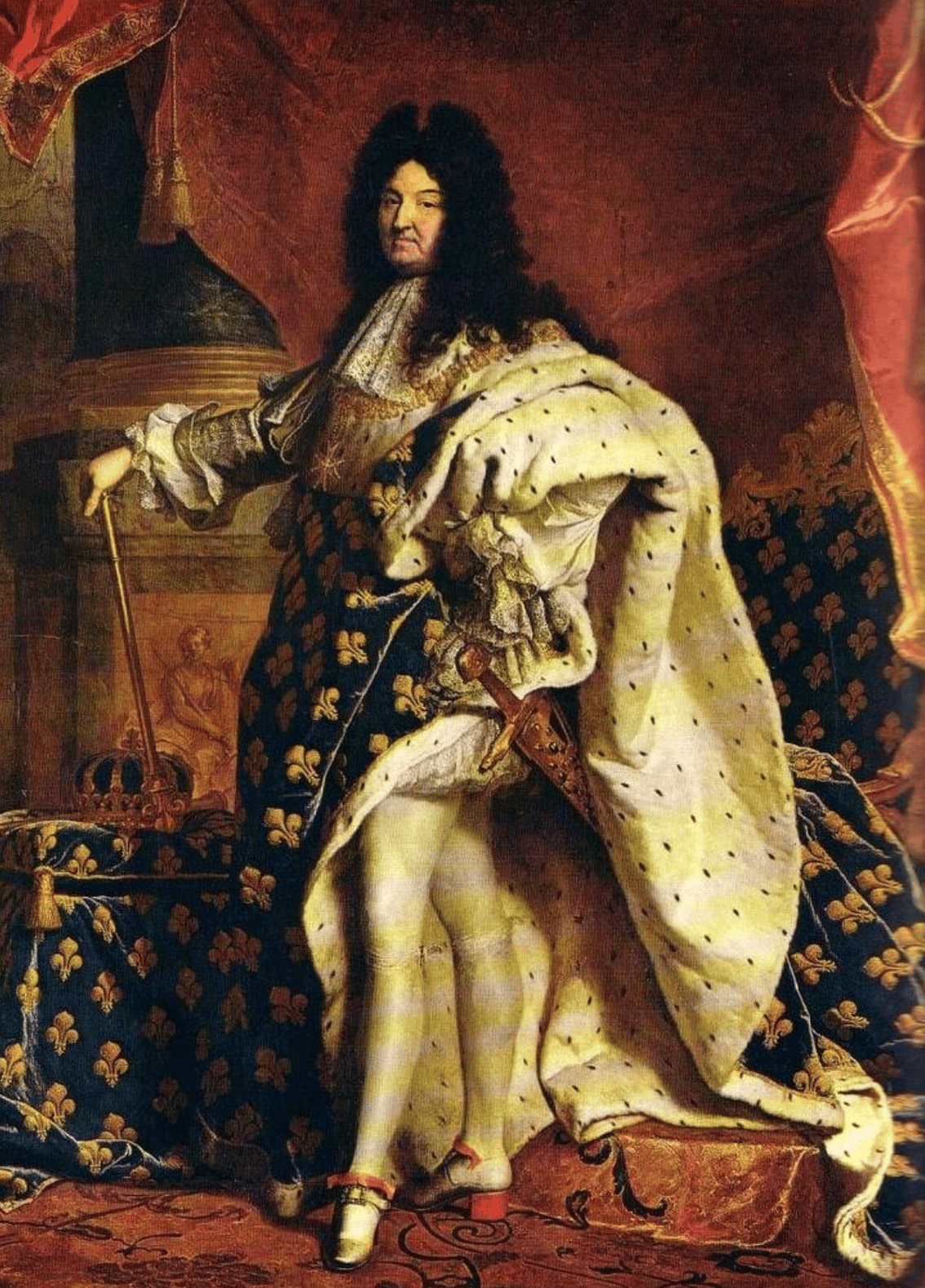 Louis XIV dressed in garments bearing the royal emblems of France
